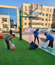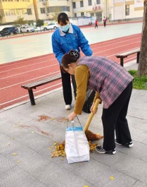在篮球场,在步道旁,他们分工有序:有人负责清扫,有人负责装袋,配合默契。一个弯腰,一次抬手,都藏着对园区的细心呵护。即使落叶不停飘落,他们也用耐心和坚持,让“落叶不落地”不再是一句口号。