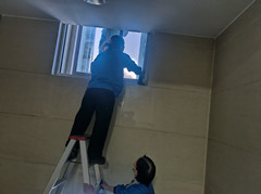 门窗规整大气,合页处的洁净直接关乎整体整洁感,遇到顽固污渍,她便放慢动作反复擦拭,还会搭配干净抹布二次清理,生怕留下一丝遗漏。擦完窗框,她立刻换上干净的干抹布配合玻璃刮,从玻璃顶端至底端匀速刮拭,动作流畅而平稳。边角处的水渍,她会用干抹布仔细收干,确保玻璃表面洁净透亮,能清晰映照出晨光下大楼的整洁清爽。