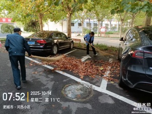 保洁阿姨和师傅默契配合,一人在前清扫,一人在后归拢,让铺满落叶的车位渐渐露出原本的模样。深秋的凉意挡不住他们的专注,每一次挥动扫帚,都是对“家园整洁”的承诺。