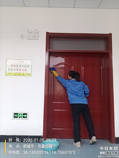 门窗规整大气,合页处的洁净直接关乎整体整洁感,遇到顽固污渍,她便放慢动作反复擦拭,还会搭配干净抹布二次清理,生怕留下一丝遗漏。擦完窗框,她立刻换上干净的干抹布配合玻璃刮,从玻璃顶端至底端匀速刮拭,动作流畅而平稳。边角处的水渍,她会用干抹布仔细收干,确保玻璃表面洁净透亮,能清晰映照出晨光下大楼的整洁清爽。